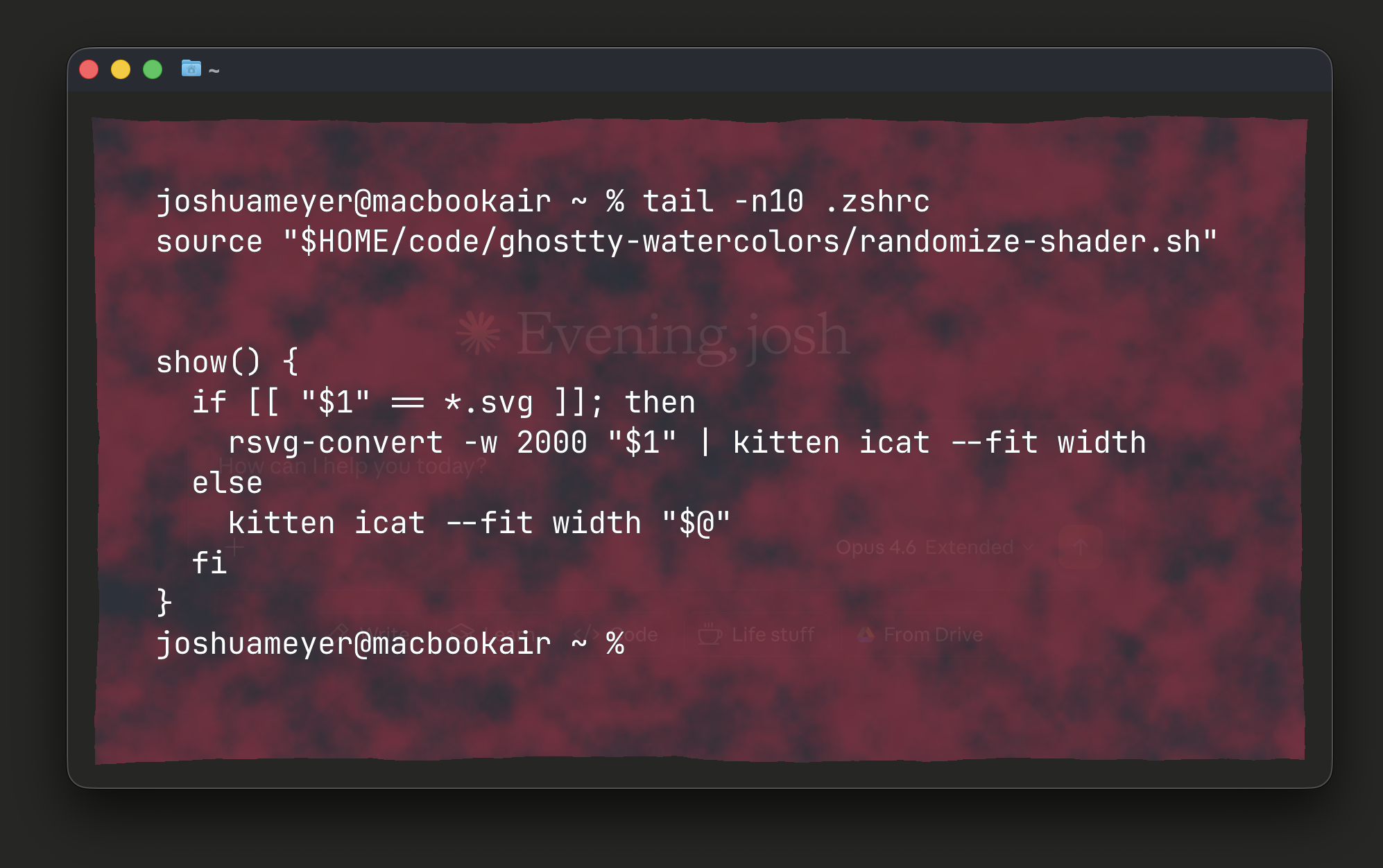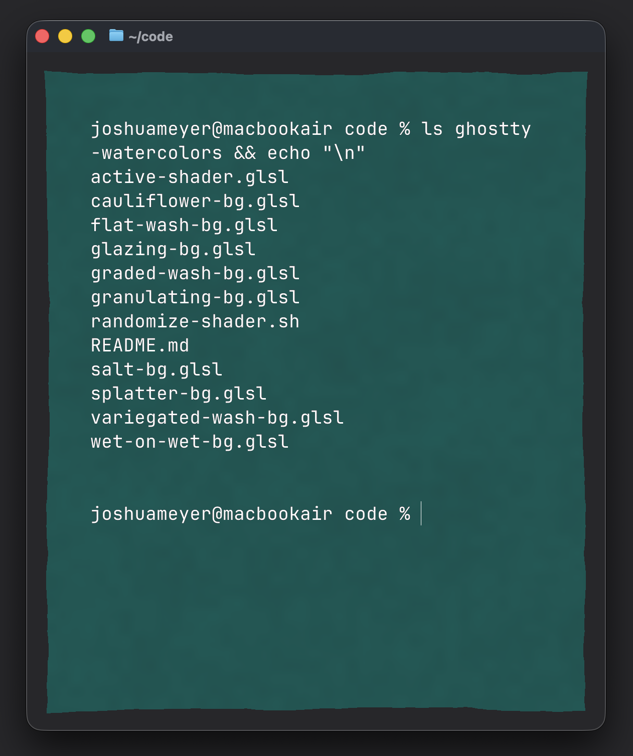 custom-shader = /path/to/ghostty-watercolors/active-shader.glslNow every new terminal window gets a different wash type and color. Pretty cool, right?