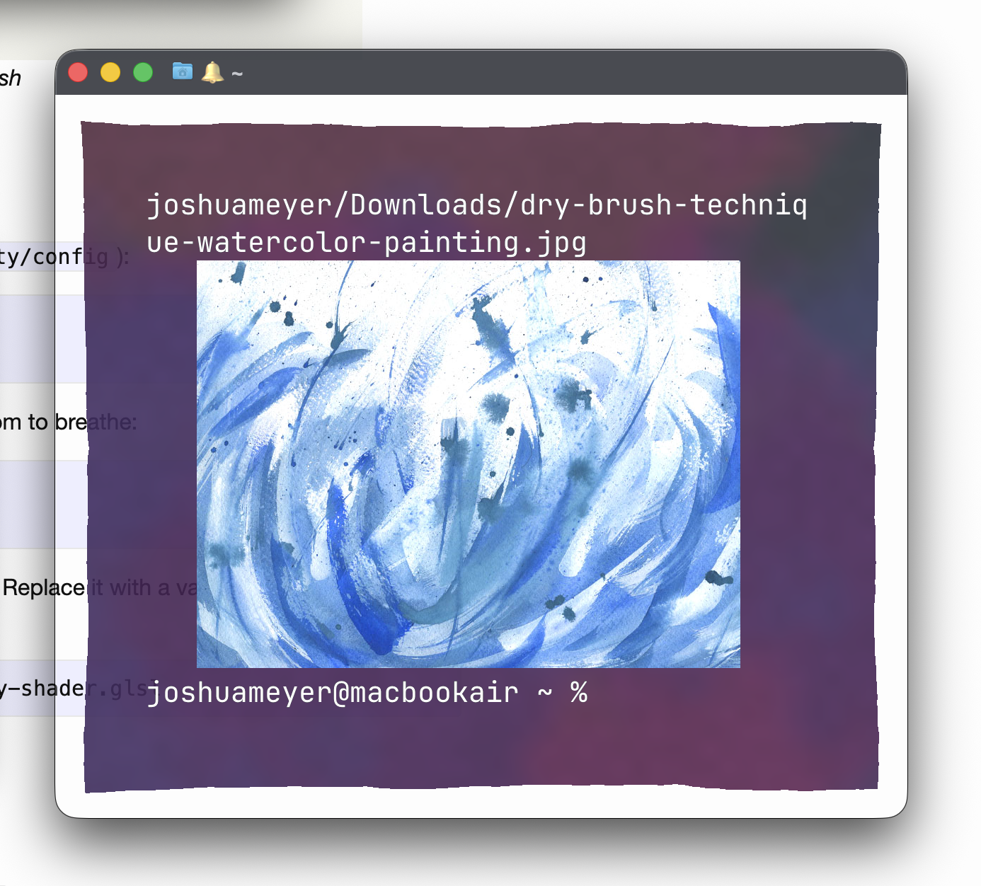 I’ve been watercoloring lately, so I wondered if I could make watercolor washes as a terminal background. I ended up making a whole collection of them, each named after a real painting technique. The repo is at github.com/JRMeyer/ghostty-watercolors. PRs are welcome :)